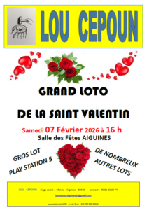 Nous avons le plaisir de vous annoncer que le grand loto de la Saint‑Valentin aura lieu le samedi 7 février 2026 à 16h, à la salle Fernand Chauvin à Aiguines 🎲💝.